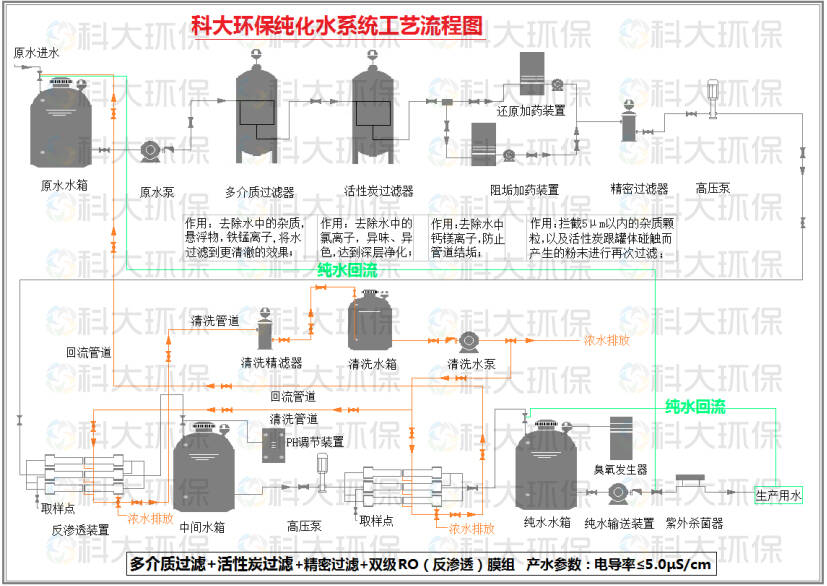 原水→原水泵→多介質過濾器→活性炭過濾器→阻垢加藥裝置→還原加藥裝置→精密過濾器→一級高壓泵→一級級反滲透 →PH調節(jié)→中間水箱→二級高壓泵→二級反滲透(反滲透膜表面帶正電荷)→純化水箱→臭氧發(fā)生器→純水輸送泵→紫外線殺菌器→用水點